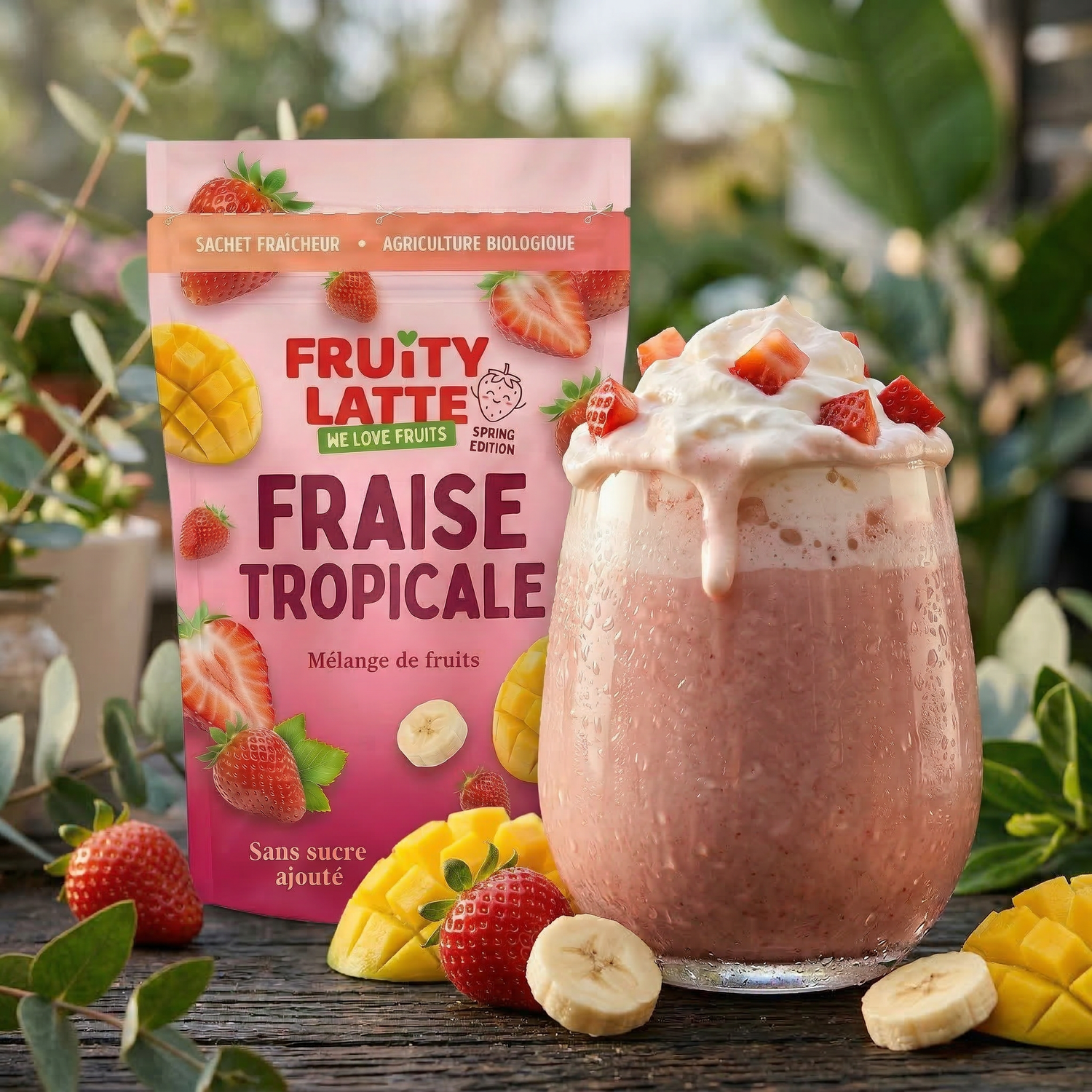 C'est une poudre de fruits 100% naturelle composée de trois fruits bio, fraise, banane et mangue, conçue pour préparer un latte fruité onctueux chez toi en quelques minutes. Pas d'arômes artificiels, pas de sucres ajoutés, pas de colorants : juste la saveur pure de ces trois fruits réunis dans une poudre magique. Chaude en hiver, glacée en été, elle s'adapte à toutes tes envies. C'est le latte tropical qu'on n'avait jamais osé inventer, jusqu'à maintenant. 🌞