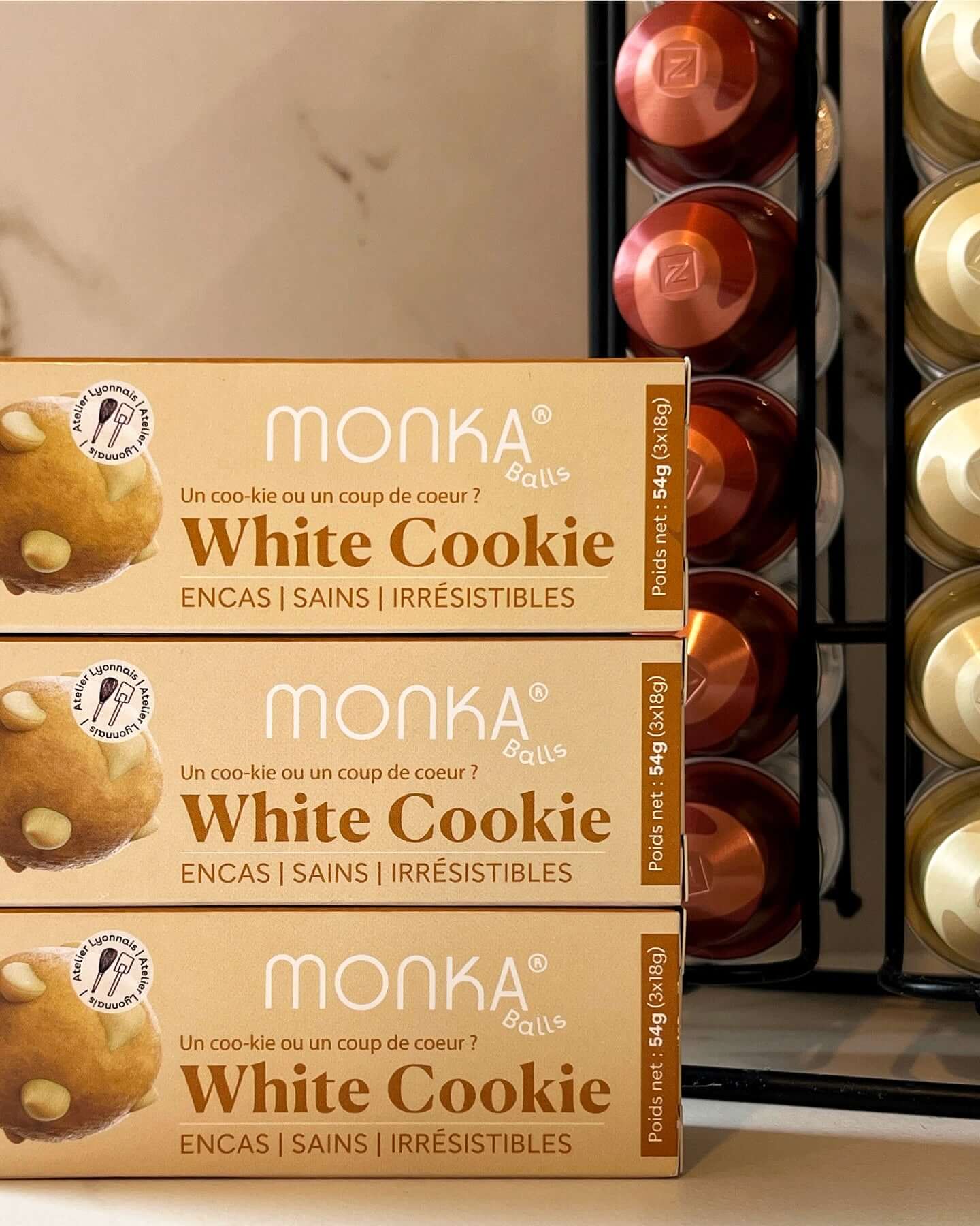 C'est le moment idéal pour craquer sur leur douceur ! Le goût de cookie au chocolat blanc est exactement ce qu'il faut pour cette pause où on a besoin de réconfort et d'énergie. Contrairement aux biscuits ou barres chocolatées qui vous laissent sur votre faim, les Monka Balls White Cookie vous calent vraiment pendant 3-4 heures grâce à leur richesse en protéines (11g) et en bonnes graisses. Le combo parfait avec un cappuccino ou un latte vanille.